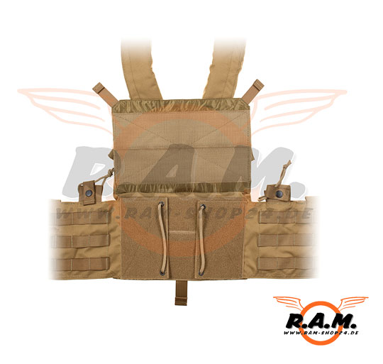 An der Weste ist ein Molleschlaufen System verteilt, über welches man zusätzliche Molletaschen spwie Patches anbringen kann.