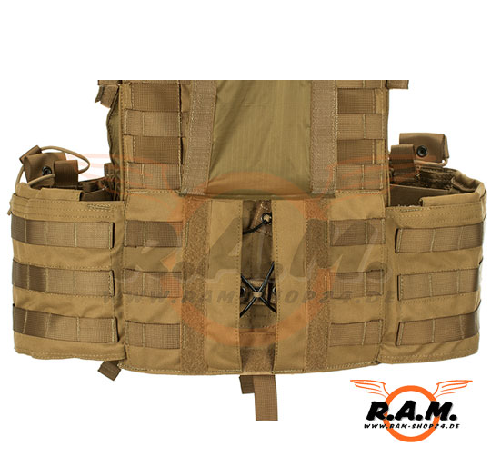 Die Weite der Weste kann individuell angepasst werden, hierzu gibt es einen Kummerbund mit Klettflächen. Dieser Kummerbund verfügt weiter über zwei integrierte Magazintaschen mit Druckknopfverschluss. Ansonsten sitzt die Weste durch 2 Gummibänder stramm am Körper.