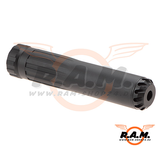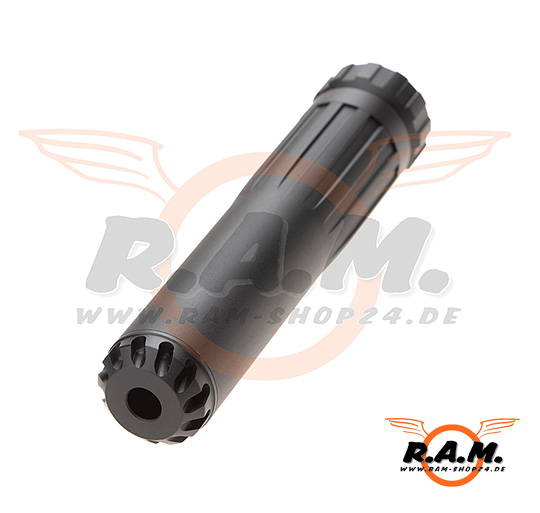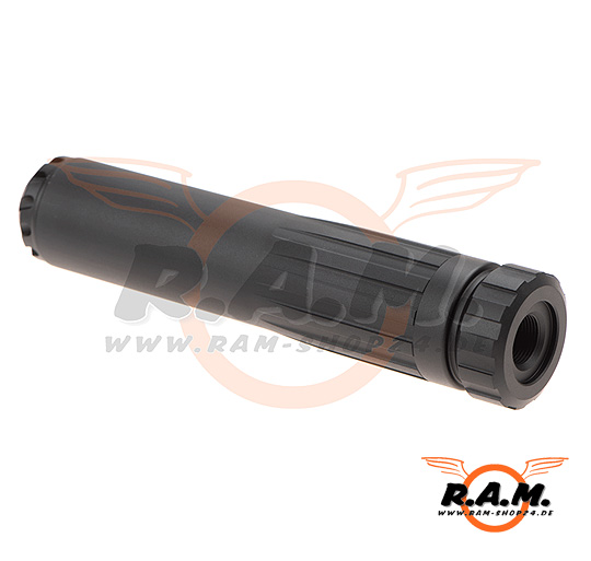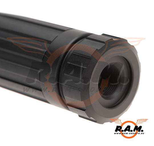 Die DDW Schalldämpferattrappe für die AAP01 bzw. für Airsoftwaffen mit einem Frontgewinde von 14mm CCW. Optisch ist die Attrappe an die runde Form der AAP01 angelegt. Somit ist er Übergang von Waffe zu der Schalldämpferattrappe sehr gelungen. Im vorderen Bereich ist der SD schön glatt gearbeitet, wohingegen im hinteren Bereich ein gewisse Struktur zu spüren ist. Diese erleichtert es einem sehr, auch bei nassen Händen, die de- bzw. montage der Schalldämpferattrappe.