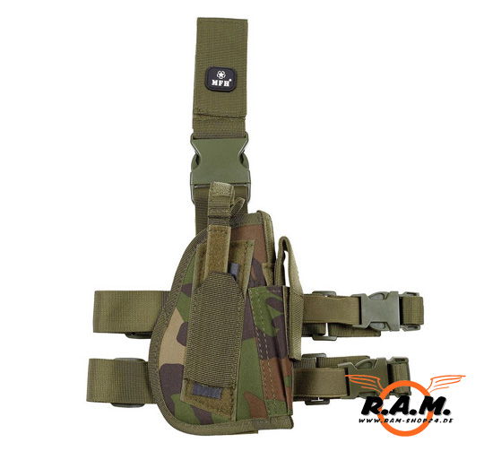 Pistolenbeinholster, woodland, mit Beingurt und Gürtelschlaufe, rechts
