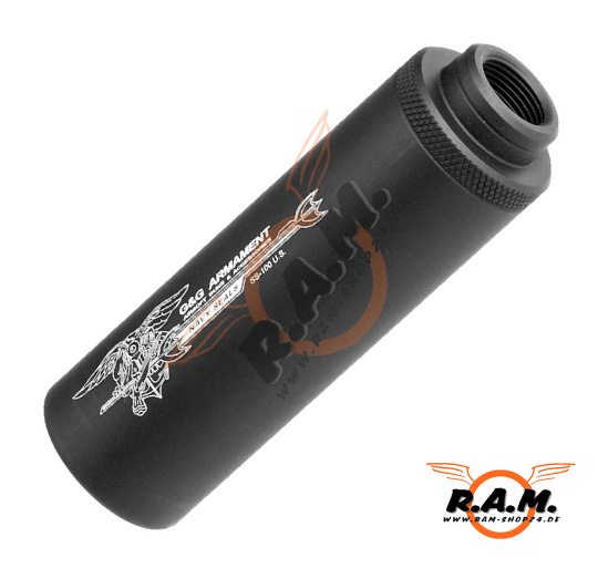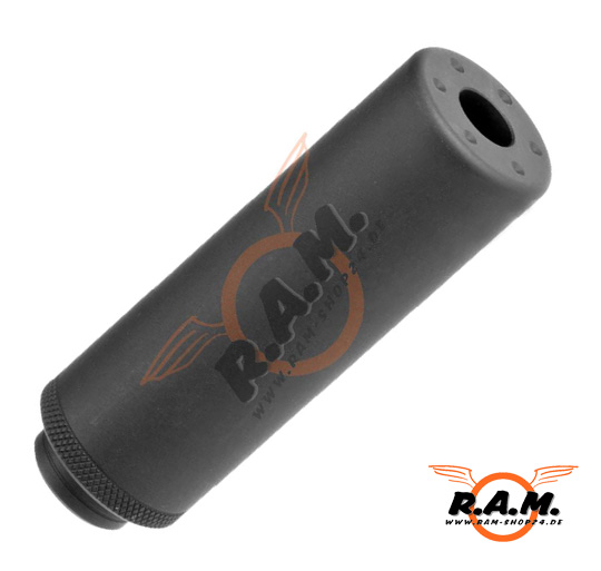 Sehr kompakter Schalldämpfer aus Leichtmetall mit CW und CCW Gewinde. Aufgrund der sehr kleinen Abmessungen insbesondere für Pistolen geeignet da er für Gewehre eher zu klein dimensioniert ist und etwas mickrig aussehen würde. Erzielt keine schalldämpfende Wirkung, darf aufgrund der grossen Unfallgefahr (Querschläger etc) auf keinen Fall mit Schusswaffen verwendet werden!