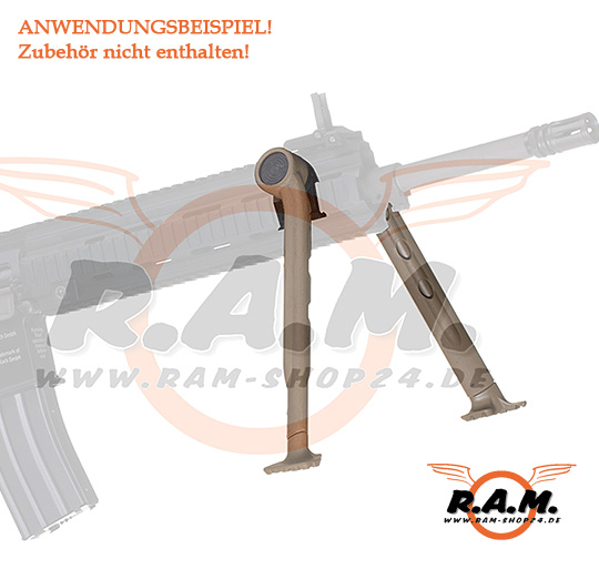 Das Set lässt sich einfach an die seitlichen Schienen des Handguards befestigen. Bei Bedarf lässt sich das Zweibein nach vorne wegklappen. Ferner ist es möglich die Höhe in drei verschiedenen Positionen verstellen.