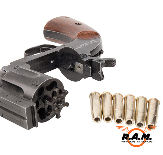 Durch das charakteristische Abknicken von Lauf und Trommel lassen sich die Hülsen mit nur einer Bewegung automatisch auswerfen. Dieses ausgeklügelte System ermöglicht ein besonders schnelles und komfortables Nachladen. Die massive Vollmetallkonstruktion sorgt für ein hohes Eigengewicht und eine authentische Haptik, während die saubere Verarbeitung den hochwertigen Gesamteindruck unterstreicht – ideal für anspruchsvolle Schützen und Sammler gleichermaßen.