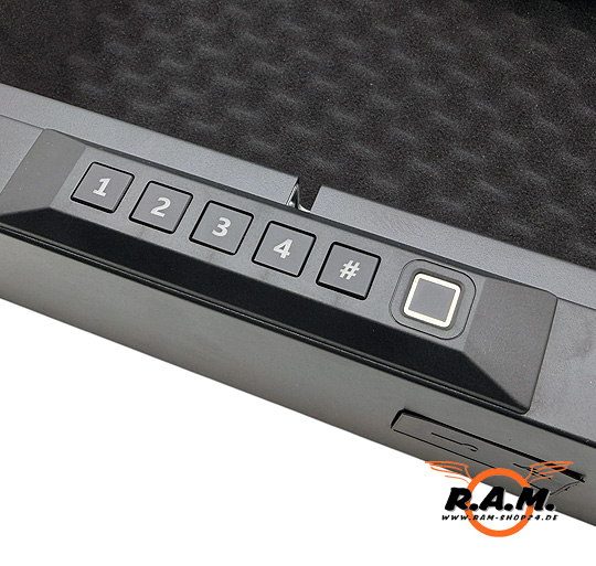 Zugriffsmethoden: Biometrischer Fingerabdruckscanner , Elektronisches 4-stelliger Code-Keypad, Mechanischer Notschlüssel