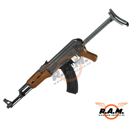 Die CM028S ist ein AKS47-Modell mit klappbarem Schaft und durchgehendem Lauf, das sich perfekt für Nah- und Mittelstreckeneinsätze im Gelände eignet.