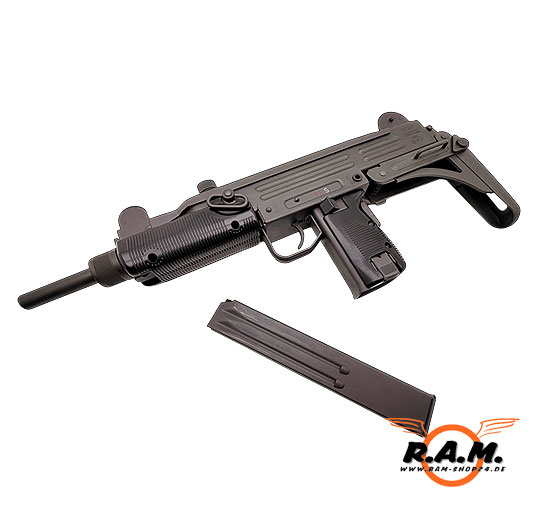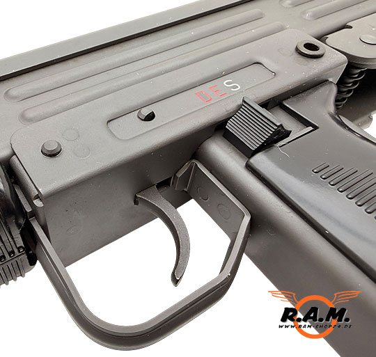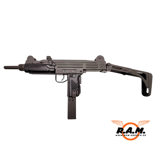 Optionales Zubehör (auf Anfrage): UZI-TAC-Umbausatz, Holzschaft, Klappschaft, Schalldämpfer für 9 mm PAK, Schnelllader DF2A 9 mm PAK, Tragegurt