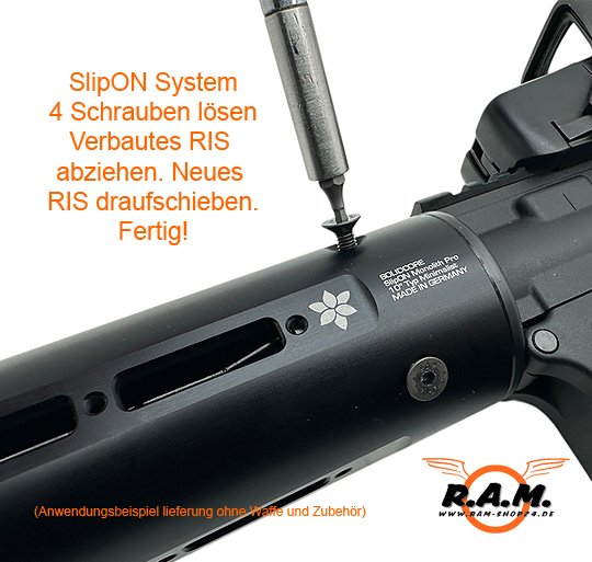 SOLIDCORE SlipON Monolith Pro ist ein RIS-Handguardsystem von SOLIDCORE GERMANY, erhältlich in drei Ausführungen: Ultralight, Diamond und Minimalist, sowie in zwei Längen (7 Zoll und 10 Zoll). Das RIS-System wird über eine, aus dem Vollmaterial gefräste, Barrel-Nut aus Stahl befestigt. Gefertigt wird das System zu 100% in Deutschland – von Entwicklung, Prototyping, Fertigung bis zum Eloxieren. Es verfügt über die SOLIDCORE SlipON Technology, die einen Systemwechsel mit nur 4 Schrauben ermöglicht, sodass verschiedene Waffen-Setups innerhalb weniger Minuten realisiert werden können (CQB oder Sniper). Vorinstallierte Anbauteile wie Frontgriffe, Schienen usw. können am RIS verbleiben; Montage und Demontage erfolgen schnell. Das RIS verfügt über vorbereitete Aufnahmen für M-Lock-Schienen an Ober- und Unterseite sowie an den Seiten (rechts/links) und diverse Gewindebohrungen zur Befestigung weiterer Schienen. Es ist stabil und verwindungssteif mit einem breiten Innendurchmesser, der die Montage von größeren Schalldämpfern, Mündungsfeuern oder Tracern ermöglicht; gegebenenfalls können solche Komponenten teilweise im RIS versenkt werden.